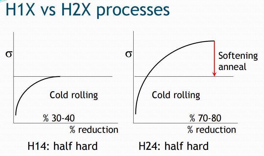 Необходимо отметить, что при одинаковом уровне предела прочности уровень пластичности будет выше в нагартованном и частично отожженном металле (H2X), чем в «чисто» нагартованном металле (H1X) (рисунок 9.2). Поэтому состояния с частичным (смягчающим) отжигом являются более предпочтительными, когда максимальная способность к формовке является главным фактором, например, при глубокой вытяжке .