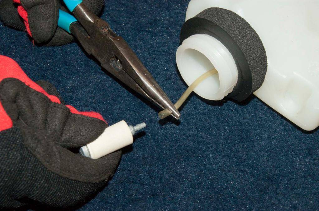 - Опустить трубку в емкость с приготовленной смесью бензина и масла