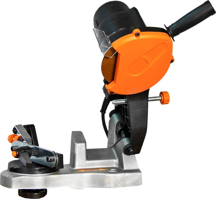 Станок для цепей отечественного производства мощностью 200 Вт. Двигатель разгоняет рабочую насадку до 6000 об/мин, поэтому заточка цепей производится довольно быстро. Диаметр заточного круга составляет 100 мм, толщина 3,2 мм, а посадочное гнездо у него 10 мм. В зависимости от типа цепи можно выбирать угол заточки от 0° до 30°. На корпусе устройства располагается ограничитель глубины заточки — он необходим, чтобы во время работы случайно не разрезать цепь избыточным надавливанием.
