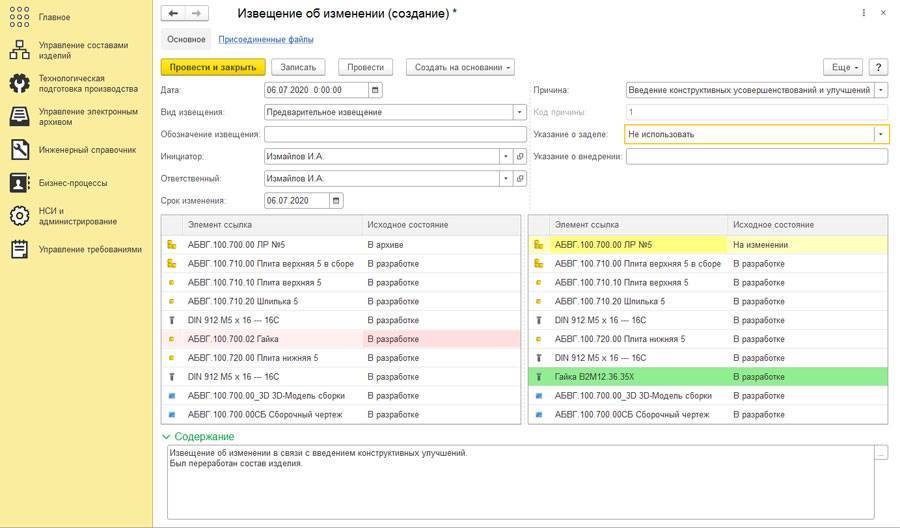 Система позволяет проводить изменения как в формате извещения об изменении, так и в упрощенном формате автоматического оповещения абонентов об изменении версии. Использование этих инструментов позволяет вести детальную историю изменений данных об изделии и получать в режиме реального времени информацию о проведении изменений: