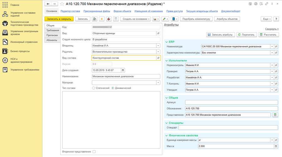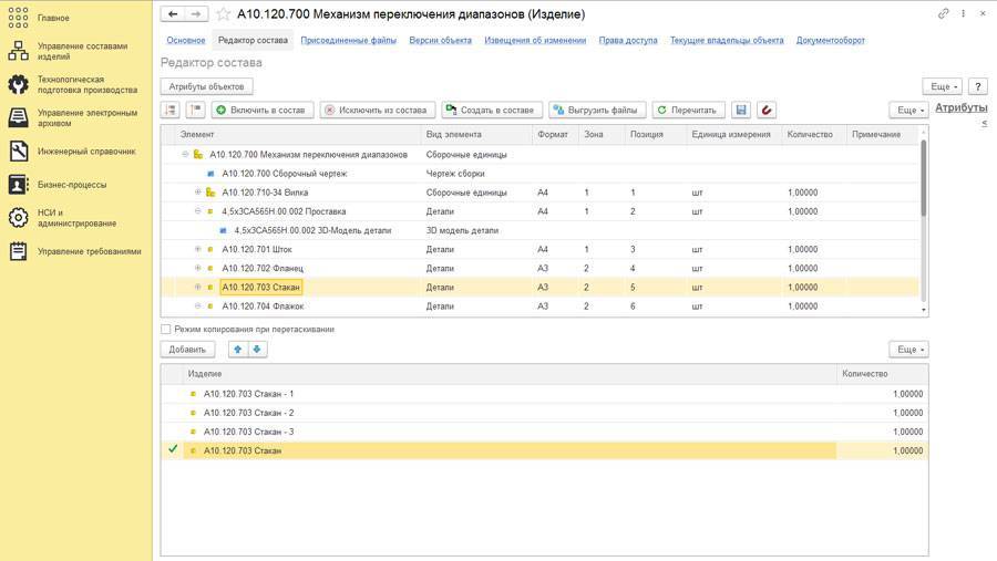 Система позволяет формировать состав изделия (цифровой двойник изделия), управлять документами в рамках состава изделия, управлять вариантами и заменами. Управление информацией об изделии ведется на нескольких уровнях: