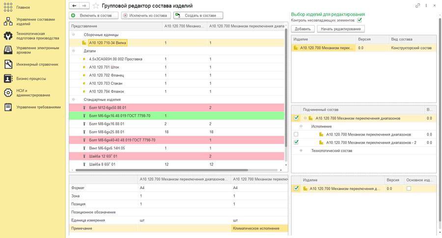 Пользователь может осуществлять групповое изменение и сравнение составов изделий. Это позволяет сравнивать как различные версии одного состава, так и разные составы изделия на протяжении его жизненного цикла: