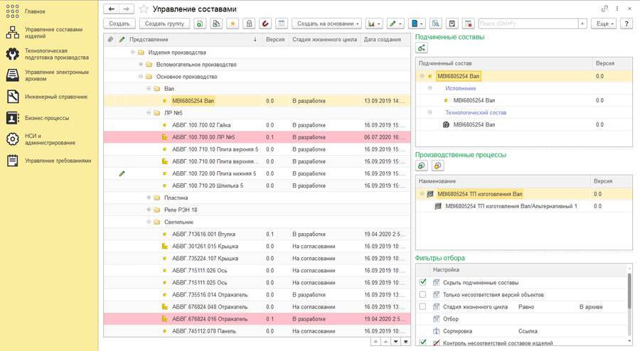 При ведении большой базы изделий система позволяет получать информацию, скрывая или выделяя изделия из общего списка в соответствии с заданными параметрами фильтрации. Руководители в режиме реального времени смогут увидеть перечень устаревших, недоработанных и уже согласованных и переданных в производство изделий.
