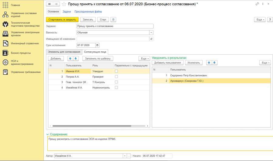 Пользователь может запускать электронное согласование конструкторско-технологической документации и электронной структуры изделия, перечень согласующих лиц может быть заполнен по шаблону. Кроме того, можно отследить на каком этапе запущенный процесс согласования был остановлен, и кто из согласующих не принял согласование к рассмотрению: