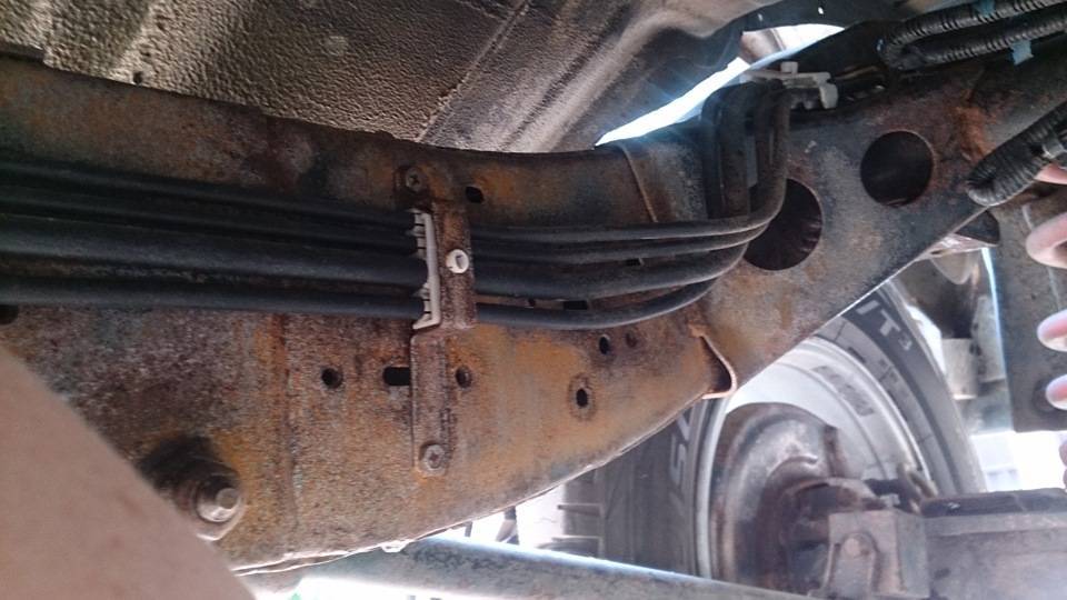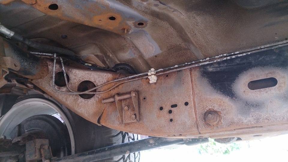 Патруль — машина хорошая. Но сильно подвержена коррозии. Хотел было обработать скрытые полости жидким раст-стопом, а снизу снаружи — густым. Раст-стоп штука хорошая, но если в щелях и скрытых полостях он как-то держится, то на открытых ровных местах быстро смывается, особенно реагентами и нефтепродуктами, так или иначе попадающими на асфальт (все замечали, что на шоссе “дворники” размазывают по стеклу маслянистую пленку?). Поэтому я не мог на отъе.ись намазать, нужно было устранить жуки хотя бы на открытых местах и покрасить. Вот так выглядела рама и лонжероны перед началом работ: