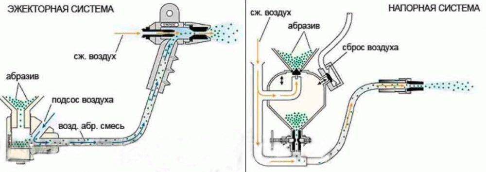 Аппарат независимо от схемы сборки формирует совместный выходящий поток воздуха и абразива. При сборке по напорной схеме песок под воздействием давления поступает в выходной патрубок, в котором осуществляется его смешивание с поданным от компрессора воздухом. Для образования вакуума в канале поступления абразива в эжекторных аппаратах используется эффект Бернулли. Песок подается в зону смешения под действием только атмосферного давления.