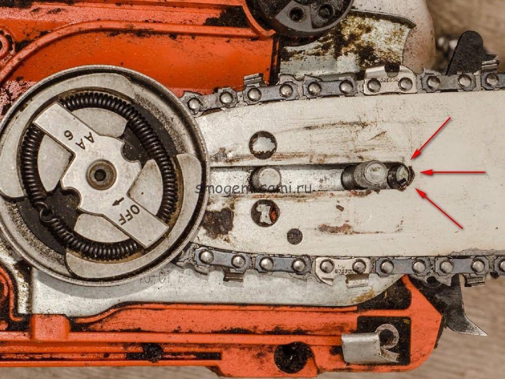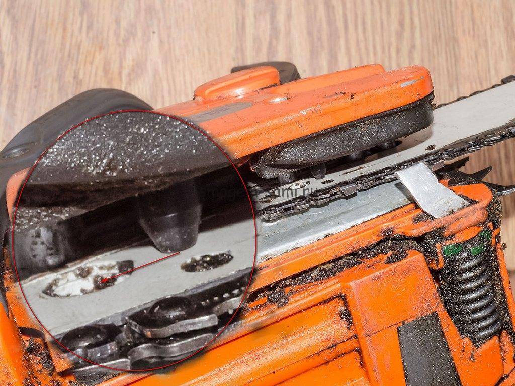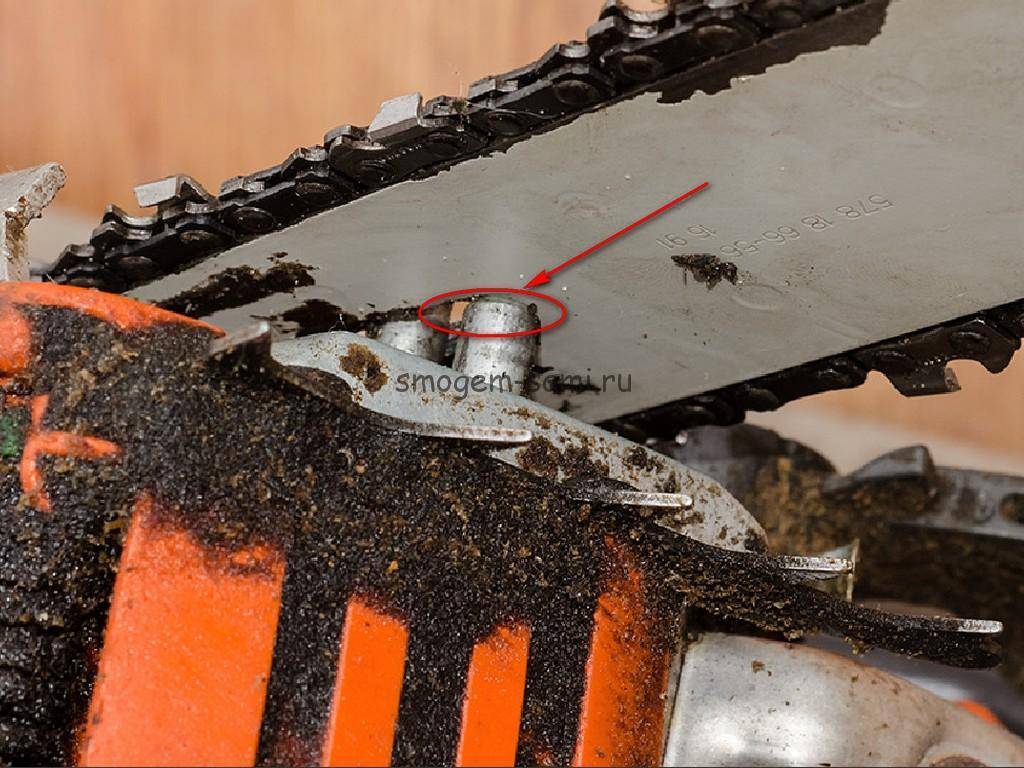 Уже предвкушая возросшую до небес производительность пилы с новой цепью, ставлю все на место. Не скажу, что легко, но шина становится, а цепь одевается и свободно прокручивается. А вот при попытке поставить на место крышку, натыкаюсь еще на один «нежданчик» — даже уведенный в крайнее левое положение палец натяжителя цепи не дотягивается до своего паза в шине.
