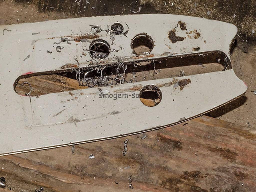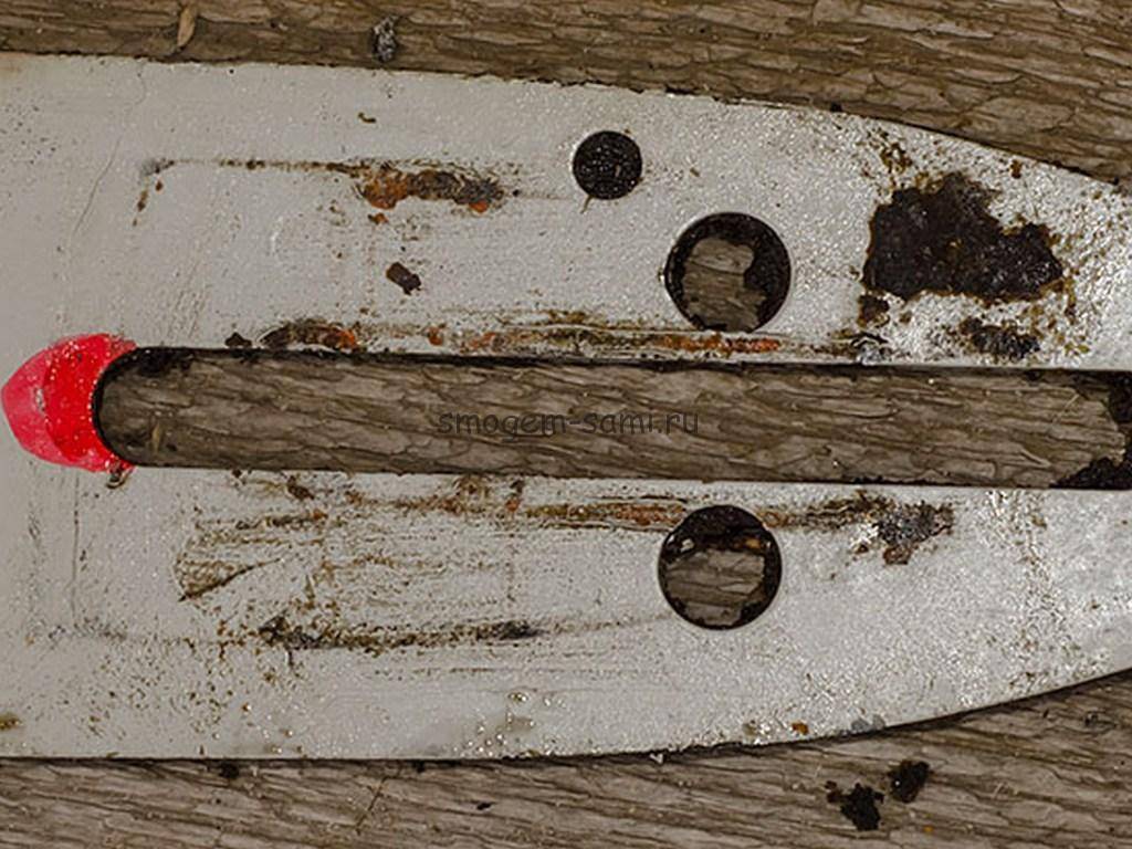 На фотографиях хорошо видно, что длины продольного паза на шине с укороченной цепью тоже не хватает, а, значит, ее придется удлинять. Красным маркером я обозначил, что нужно будет убрать на шине.