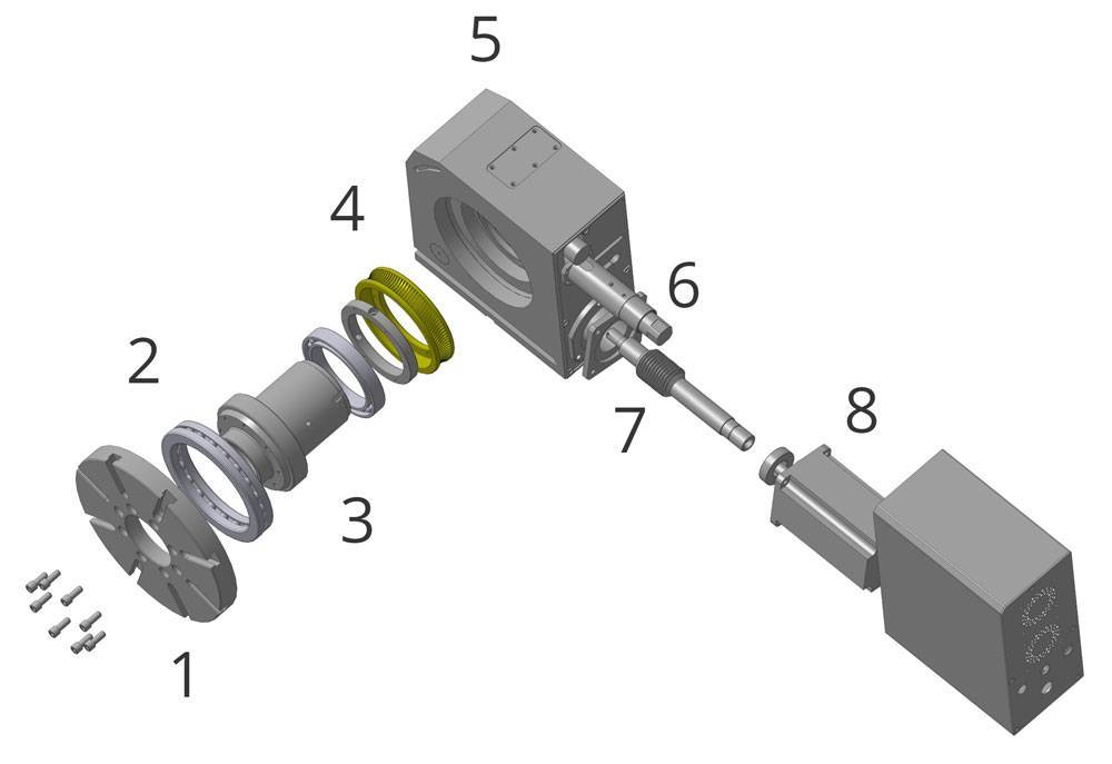 Выполнен из легированной стали. Допуск по торцевому биению менее 1 мкм. На планшайбе имеются 8 Т-образных пазов шириной 16 мм с квалитетом H14. По торцу нанесена градусная шкала с шагом 1°, для визуального контроля положения.
