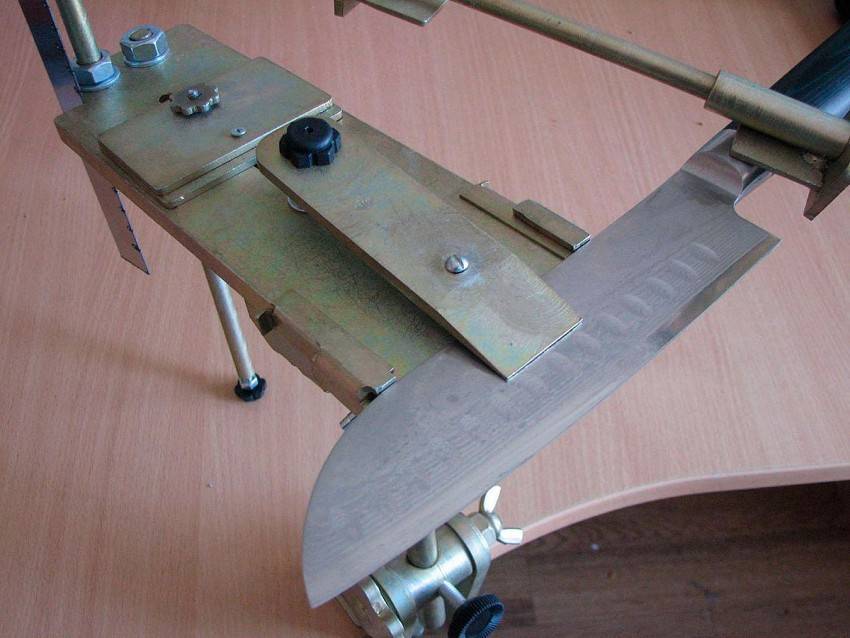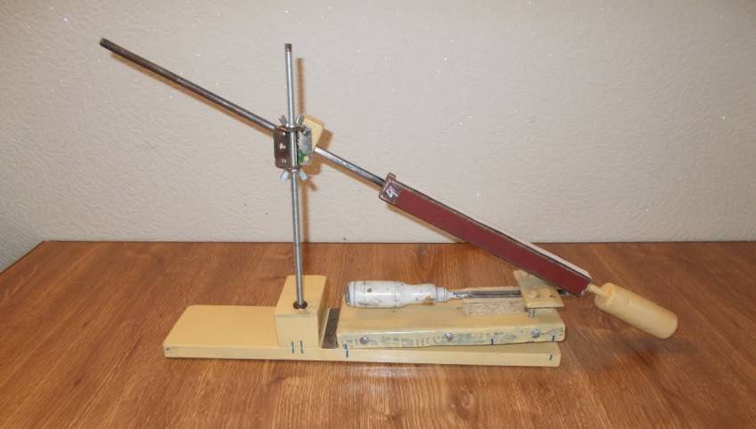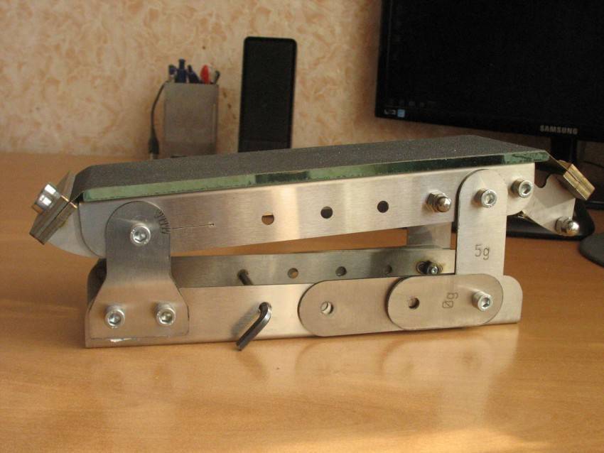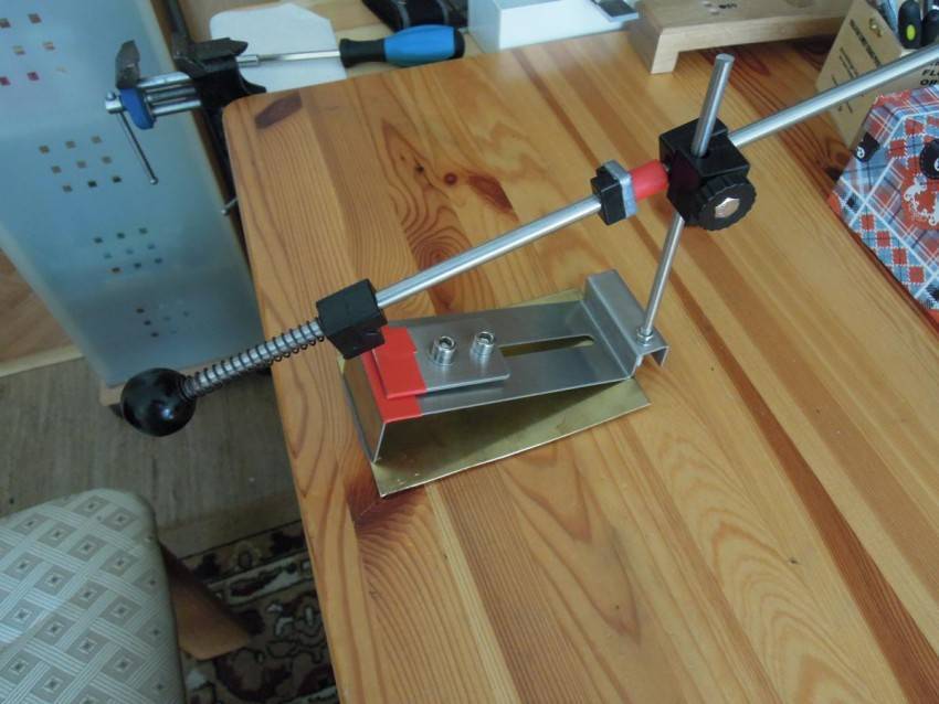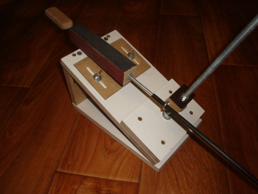 Для это потребуется надежный и устойчивый упор для крепления и подвижной брусок. Самое простое приспособление имеет форму домика, использовать его в быту сможет даже ребенок. Самодельные приспособления предназначены для точного удержания угла наклона к лезвию, добиваясь таким образом высокого качества работы.