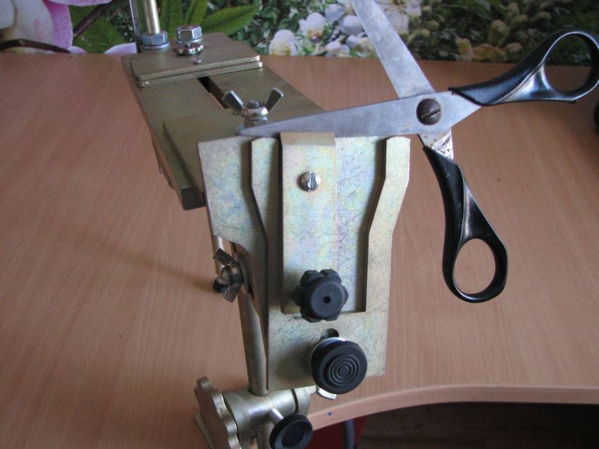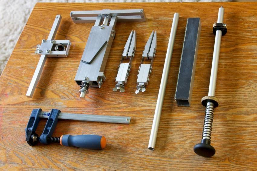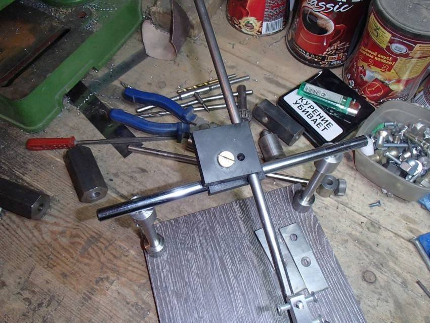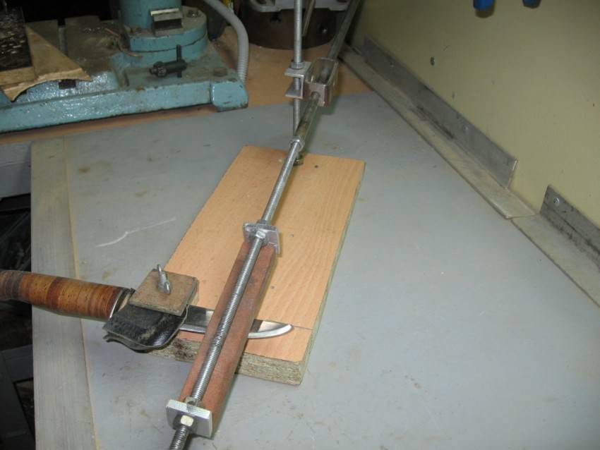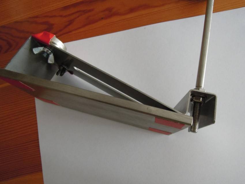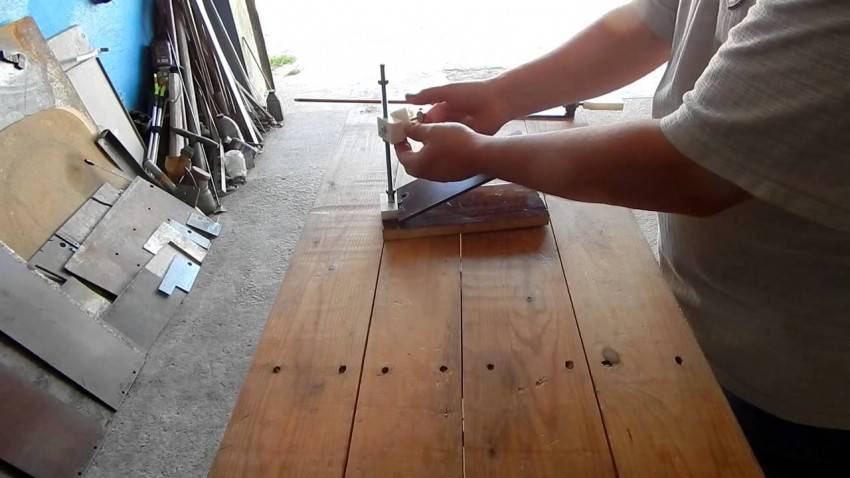 Разновидностью самодельного приспособления есть конструкция с движимой, регулируемой площадкой и устойчиво крепящимся в ней ножом. Такая конструкция для крепления требует идеально ровной поверхности.