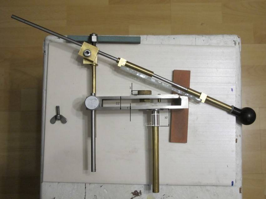 Для такого приспособления подойдет мраморная столешница, можно, так же, на обычный стол положить стекло. Чертеж приспособления для заточки ножей несложно подготовить даже человеку без опыта, для это достаточно школьных знаний и на основании чертежа приступить к созданию требуемой конструкции.