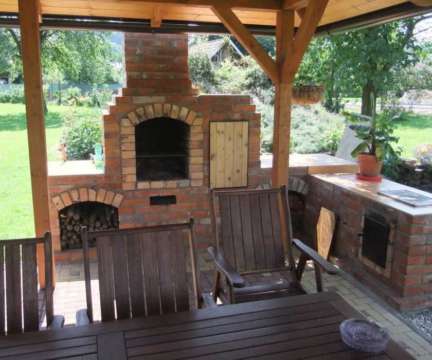 Если за основу брать конструкцию с дымоходом, то ее можно расположить, как на открытом воздухе, так и под навесом, а то и в беседке.