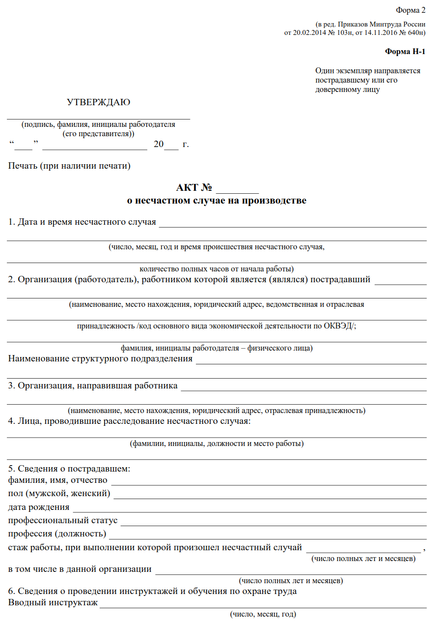 Каждый несчастный случай связанный с производством оформляется актом о несчастном случае Н-1, а при тяжелом и несчастном случае со смертельным исходом оформляется еще и акт по форме 4. После оформления акта Н-1, несчастный случай в обязательном порядке заносится в журнал учета несчастных случаев (скачать шаблон).