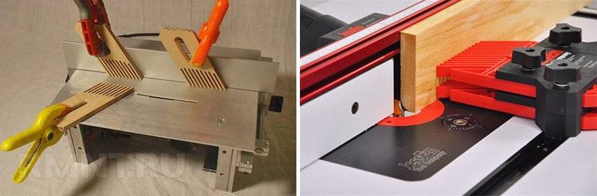Монтируются боковины-ограничители, причем обязательно должны быть фиксаторы, чтобы ее надежно закреплять. Чтобы поставить упор на заготовку, планка двигается в пазах и фиксируется через щель струбцинками. Лучше всего сразу закрепить линейку или рулетку на станине – это намного облегчает работу. Толкатель удобен для работы с небольшими заготовками – он позволяет закреплять деталь с двух сторон, что обеспечивает точность в работе