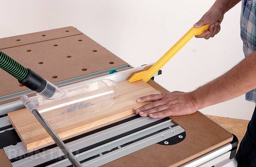 - Для мелких деталей изготовьте или приобретите толкатель — он позволит избежать опасной близости рук и пильного диска.