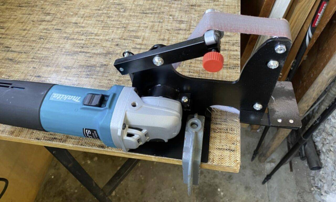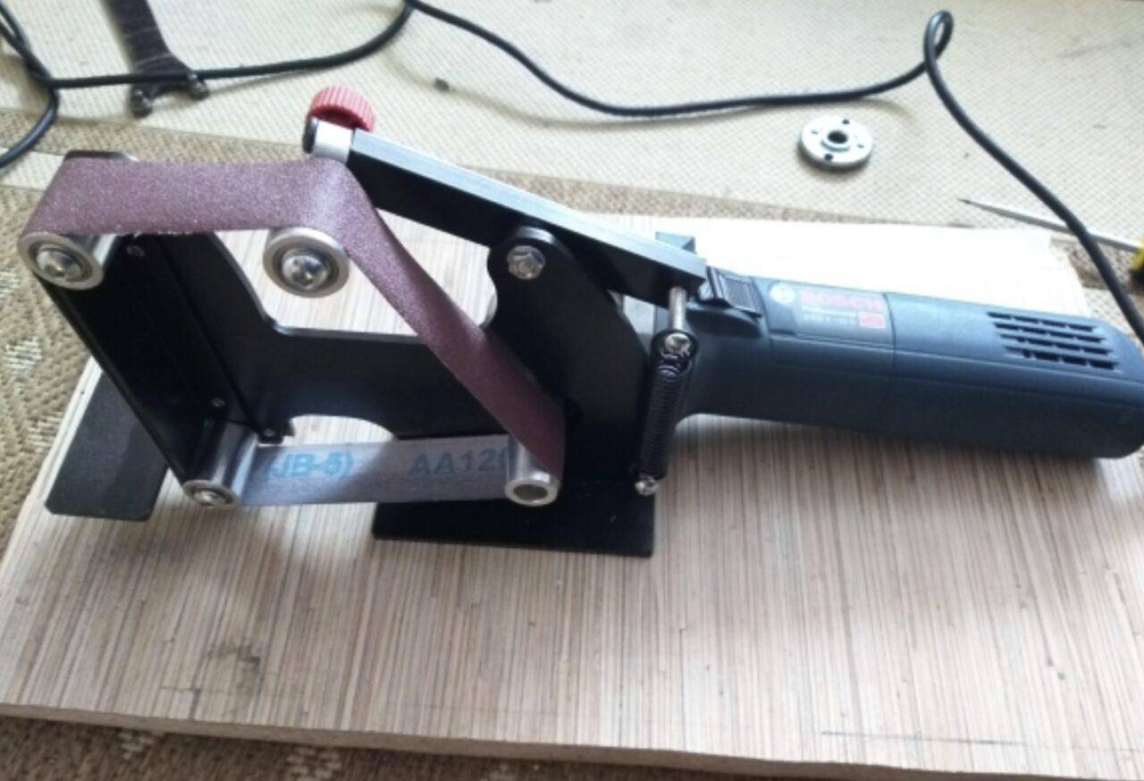 Гаджет рассчитан на подключение к машинке со стандартом диска – 100мм, 115мм, 125мм. Для его работы нужна шлифовальная лента, специальным образом склеенная наждачная бумага, шириной от 30мм.