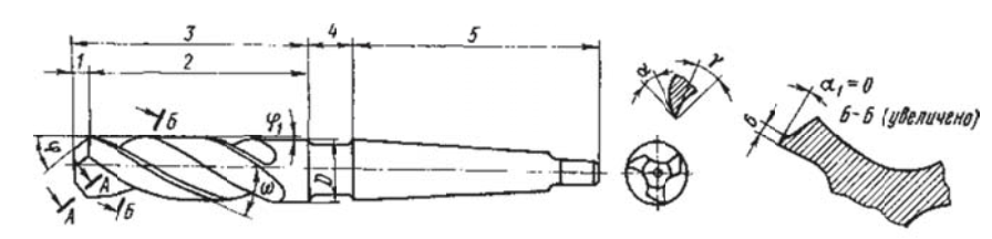 Задний угол α=8÷10°. Угол наклона винтовой канавки ω=10÷25°. Для лучшего направления зенкера при резании в его зубьях оставляют цилиндрическую фаску шириной 1,2-2,8 мм.