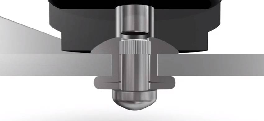 - Рабочая часть заклепочника с установленной заклепкой помещается в подготовленное отверстие в металлической основе.