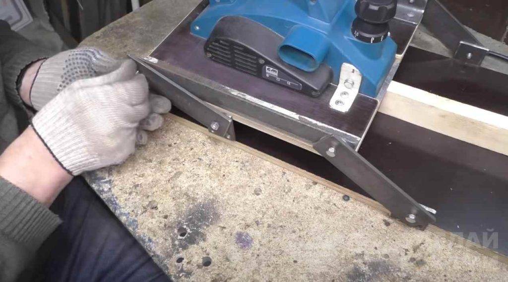 Дополнительно автор прикручивает к фанере две направляющих. Расстояние между ними должно быть равно ширине ножа рубанка.
