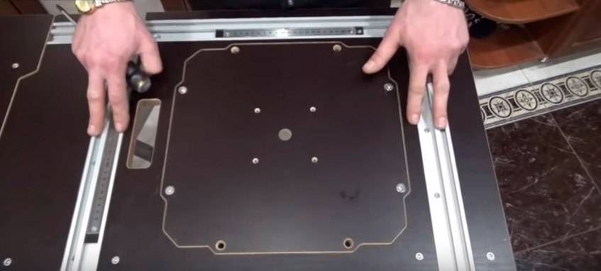 Вкладыш прикручивается к столешнице винтами и держится в установленном положении без зазоров. После выполнения работ он также легко вынимается. Его просто переворачивать и устанавливать в положение, удобное для мастера.