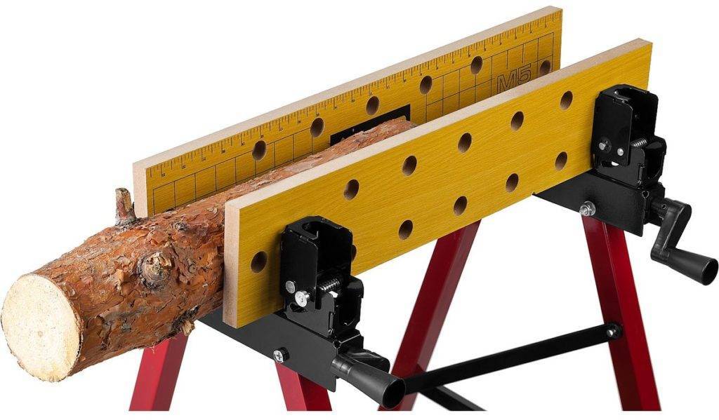 Деревянная столешница – раздвижная. Отверстия на поверхности позволяют фиксировать и обрабатывать детали различных форм. Створки могут использоваться, как тиски, расположены наклонно к основанию и могут фиксироваться под углами в 45 и 90 градусов. Поэтому устройство подойдёт как для обработки длинномерных, габаритных деталей, так и заготовок круглого сечения, например, труб.