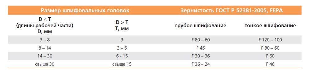 При выборе зернистости для шлифовальных головок учитывается диаметр и форма головки. Чем меньше диаметр шлифовальной головки, тем меньше должно быть зерно абразива. Нами рекомендуются следующие зернистости: