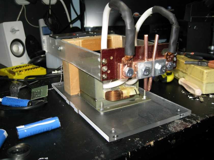 При сборке трансформатора обязательно монтируют конденсаторы, а на корпус выводят кнопки регулировки скорости и времени подачи электрического разряда. Подобный принцип позволяет регулировать процесс сварки деталей, не допуская перегревания металла и образования грубых швов.