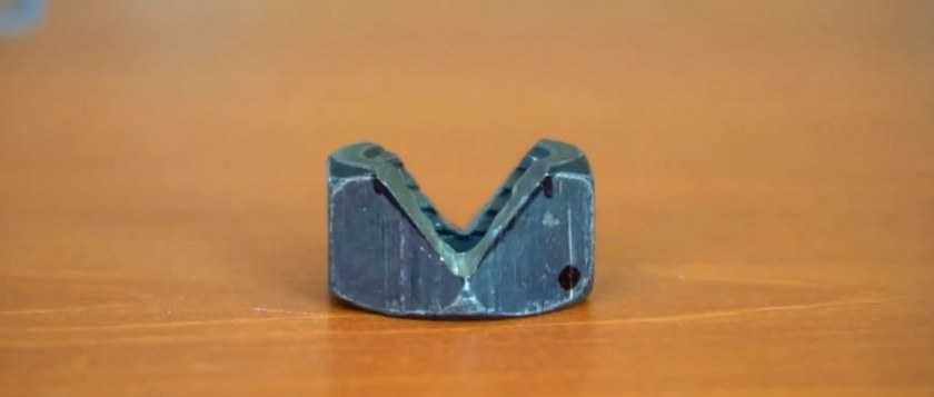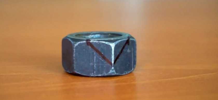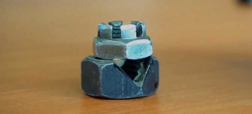 - Возьмите две гайки разного размера, с меньшей выпилите по 9 мм разрезы с трех граней с каждой стороны.