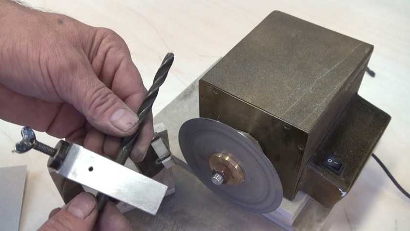 Когда оптимальное положение для сверла по отношению к точащей детали тоже найдено, надежно зафиксируйте сверло с помощью тех крепежей, которые предусмотрены в самодельном устройстве специально для таких целей. Оставьте небольшой зазор, который обычно оценивается в 1 миллиметр – ваша задача ведь не заключается в том, чтобы сломать наконечник, вы должны его лишь немного обточить. После этого запустите абразивный диск или другое точащее устройство и проверьте собственный станок в действии.