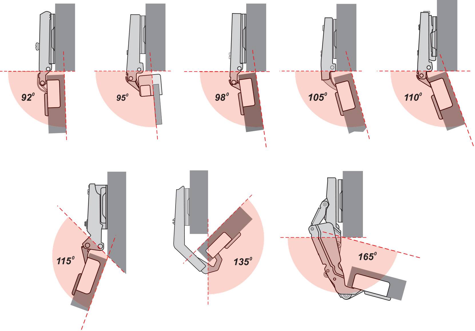 - Мебельные. Они используются при производстве и сборке мебельных конструкций. Они позволяют обеспечить распахивание фасадов на 45, 90 или 110 градусов. Элемент монтируется на шкафах, в которых дверцы размещаются внутри мебельного корпуса.
