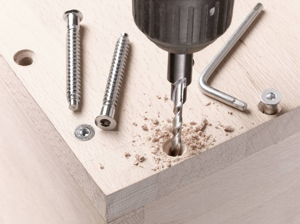 Конфирмат вворачивается в предварительно подготовленное отверстие, поэтому вопрос о том, как сверлить такое отверстие, достаточно актуален. Для этого потребуются следующие инструменты и материалы: