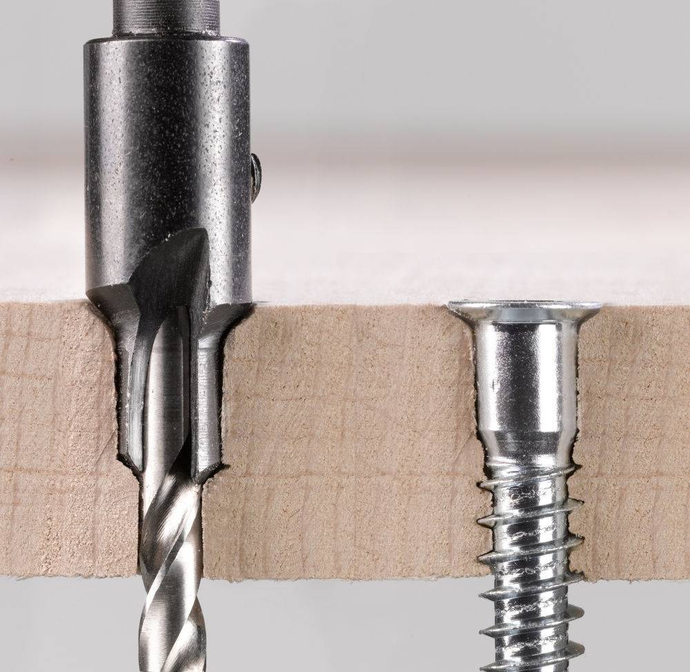 Третий шаг – зенкование отверстия для заглубления головки в материал. Это можно сделать сверлом большего диаметра, но для получения качественного результата без сколов лучше выполнить эту операцию зенкером.