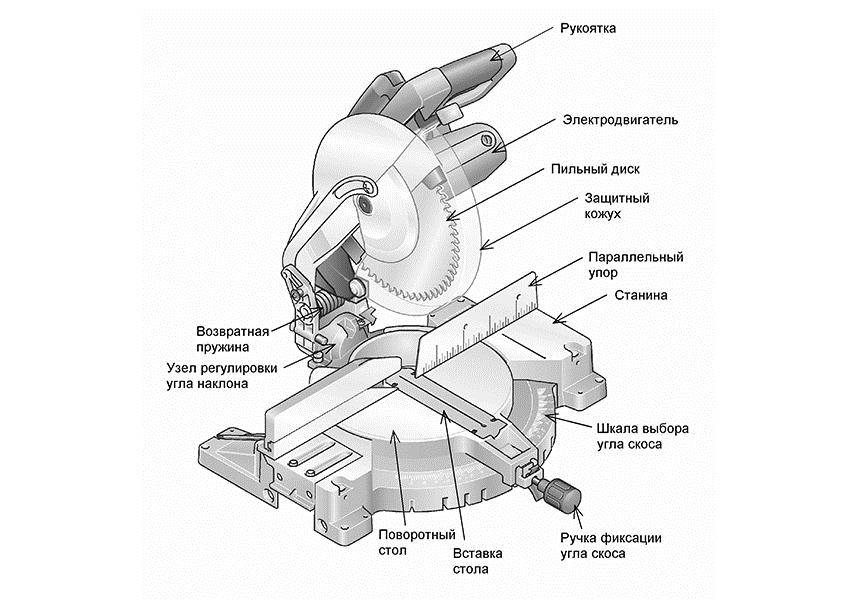 Все торцовочные пилы имеют несложную конструкцию в основном похожую для разных типов этого инструмента. Основными их элементами являются: