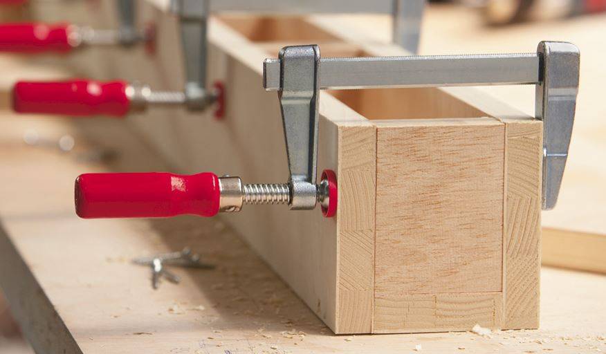 - при мебельной сборке, когда склеивают доски, щиты, нужно удержать части элементов;