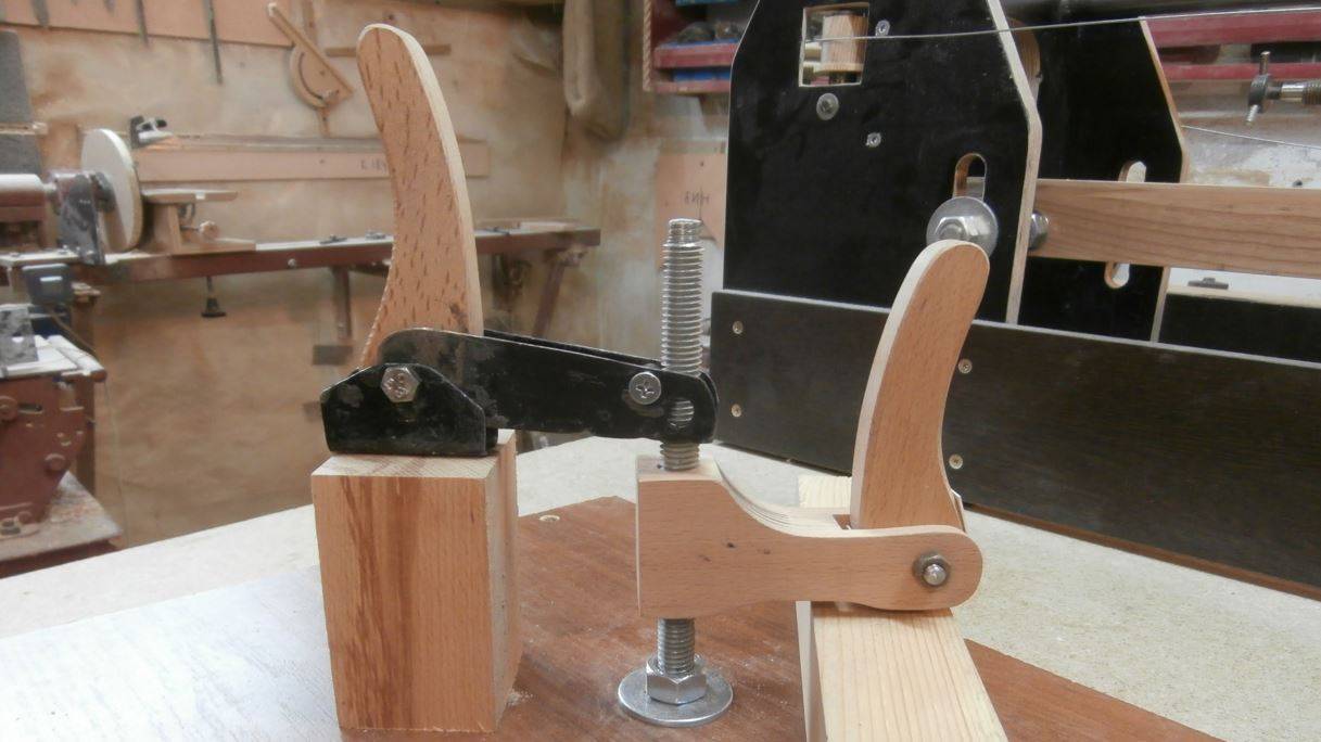 Отличие данного приспособления заключается в том, что вместо традиционного ходового винта на вертикальных губках зажима устанавливают эксцентрики из фанеры.