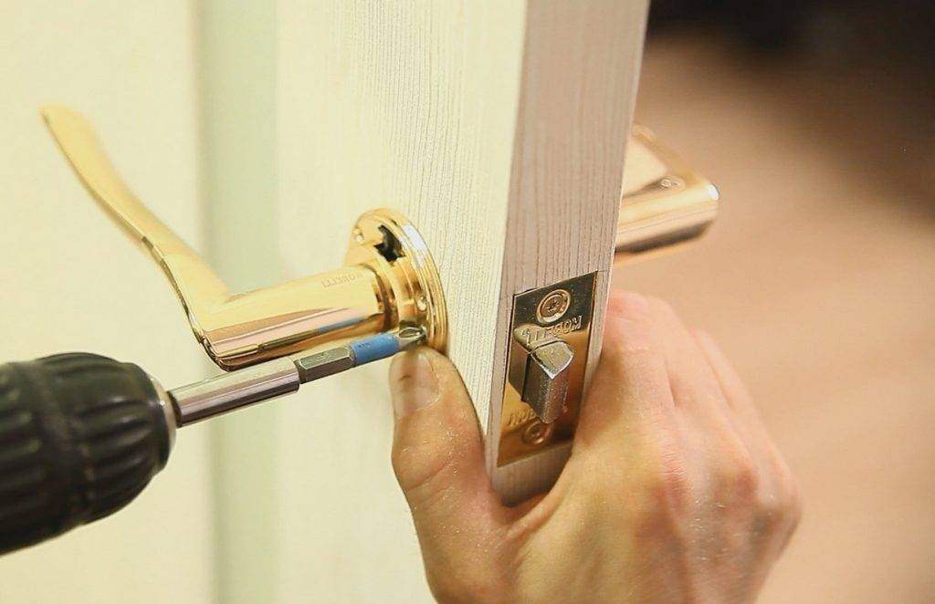 Далее дверное полотно оснащается фурнитурой — ручкой, замком (как врезать замок в дверь смотрите здесь), петлями.