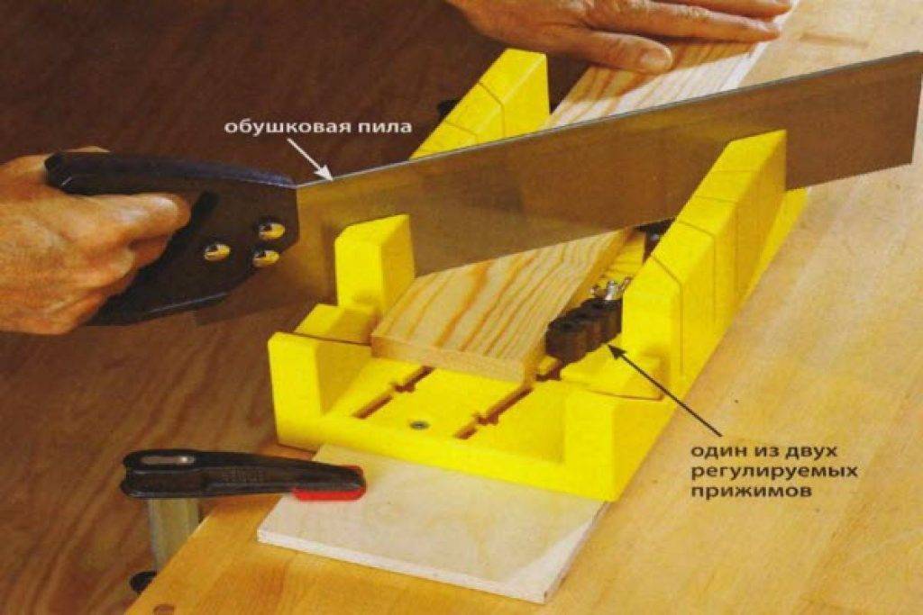 Стусло и пила. Какой именно тип инструмента нужен? Торцевая пила понадобится для точного распиливания брусков и наличников (угол распиливания – 45 или 90 градусов). Ножовка или лобзик могут сколоть края, сделать их неровными. Дисковая пила нужна для уменьшения дверного полотна в длину (если высота проема изначально низкая), а также для распиливания доборных планок.