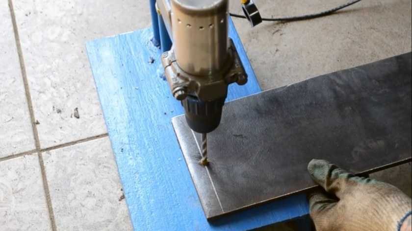 Также необходимо будет вырезать из куска металла толщиной 7-8 мм две пластины шириной 118 мм и длиной 142 мм. В них нужно просверлить отверстия ступенчатым сверлом диаметром 13 и 20 мм.