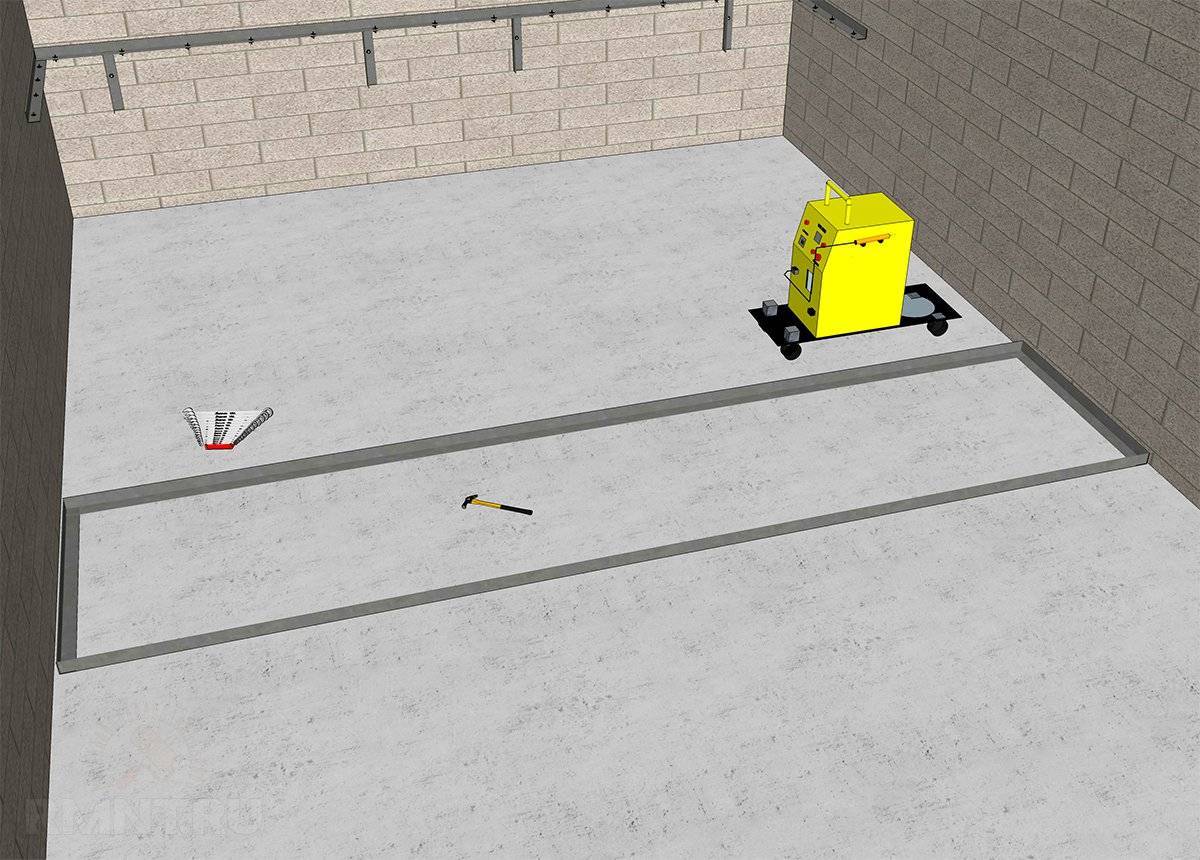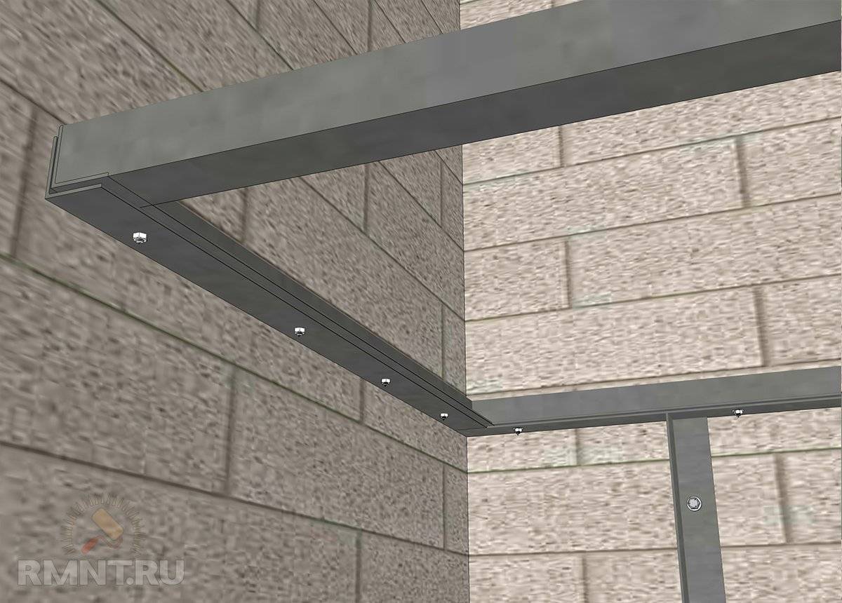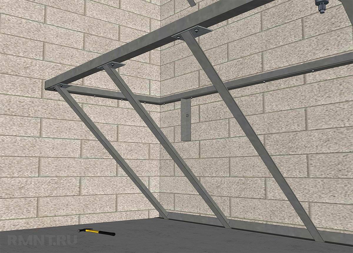 На опорный уголок уложите рамку, затем приступайте к установке опор. Их желательно сделать косыми, чтобы нижние концы ножек упирались в угол между полом и стеной. В этом месте устанавливается подкладка из отрезка угловой стали. В верхней части ножка стыкуется с рамкой в 50–80 мм от края, но не напрямую, а приваривается к пластине, которая затем крепится болтами. Косые ножки сохранят больше места для въезда легковым автомобилем.