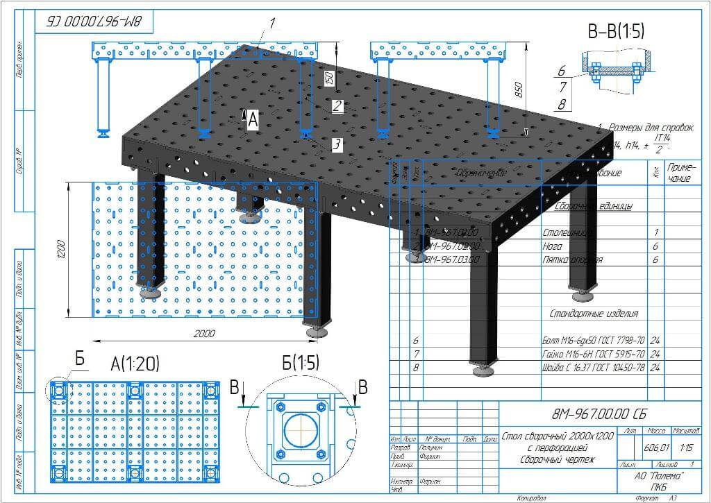 Опорой для металлической перфорированной столешницы, имеющей толщину 3 мм и более и шаг отверстий по сетке хотя бы 100х100 мм. Диаметр отверстий – 10…25 мм, в зависимости от способа креплений деталей и размера используемых приспособлений (струбцин). В перфорированном листе выполняются пазы шириной 10 мм для установки усиливающих пластин с тыльной стороны и крепления бортиков.