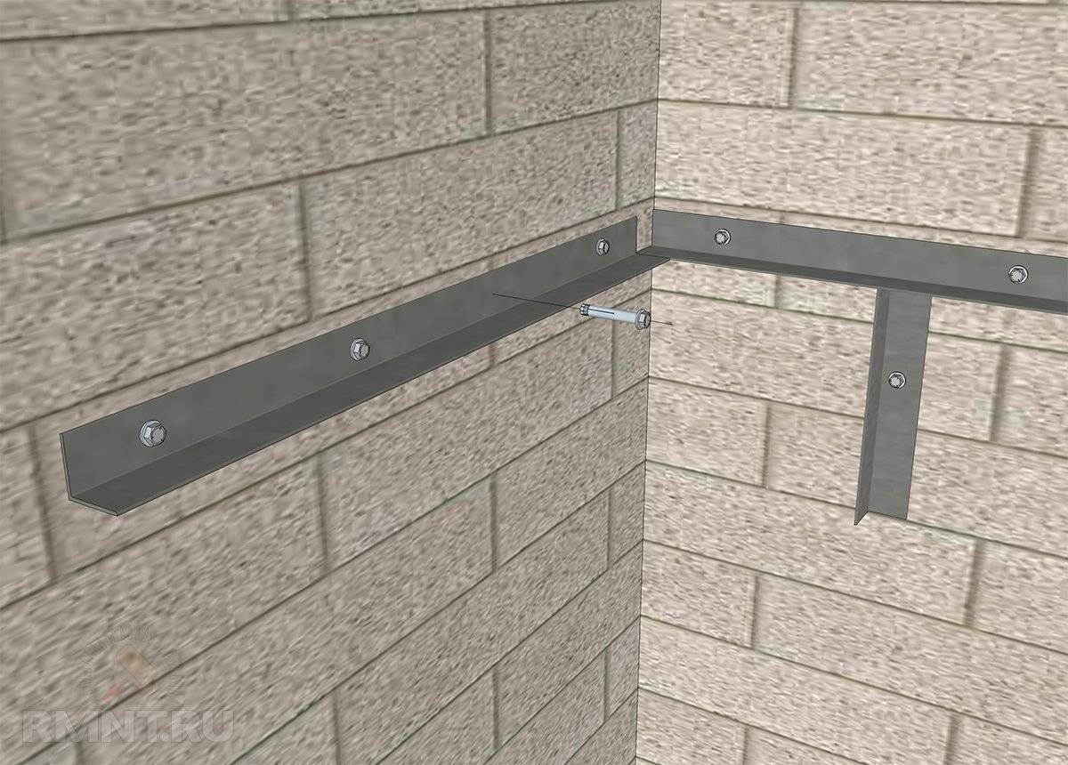 Если верстак от угла до угла, то на смежных стенах также прибивайте по уголку длиной в глубину столешницы или чуть меньше. Крепление к стене выполняется анкерными болтами и довольно часто, желательно в каждый кладочный элемент, то есть через 20–25 см. Оптимально, если через каждый метр будет приварено по 30–40 см хвосту, направленному вниз и закреплённому анкером.