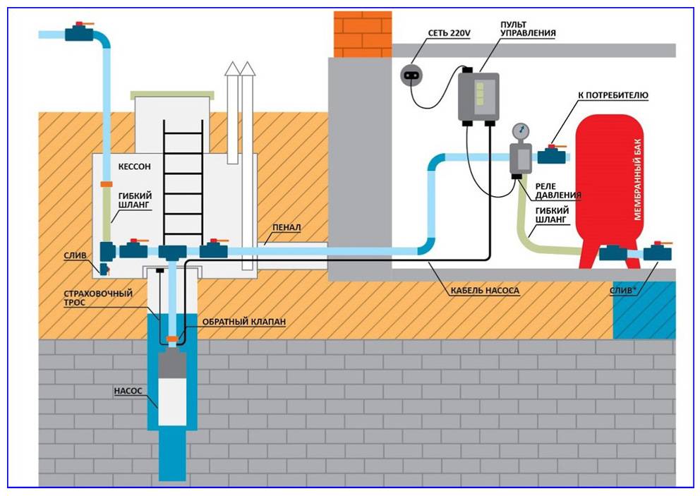 Схема водоснабжения всегда подразумевает использование насоса или насосной станции. Смонтировать устройство можно либо в доме, либо в самом кессоне над скважиной. Насос качает воду в гидроаккумулятор. А от него жидкость по трубам поступает к потребителю.