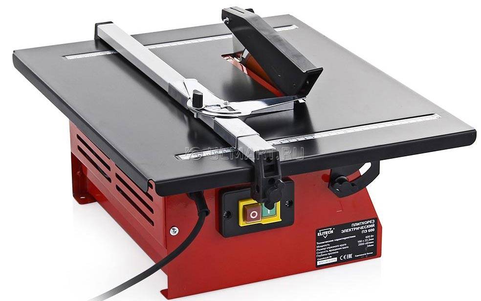 Электроплиткорез с нижним расположением двигателя. Мощность двигателя 600 Вт, скорость вращения на холостом ходу 2850 об/мин.