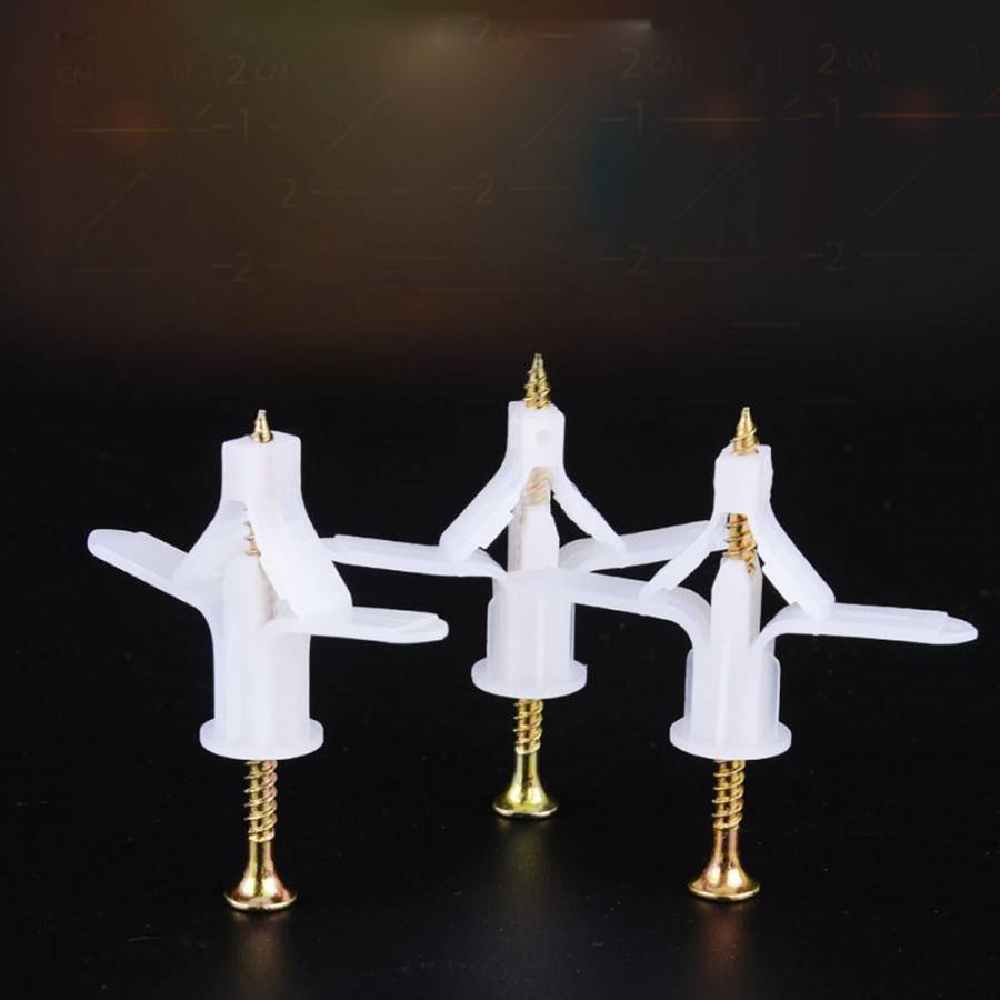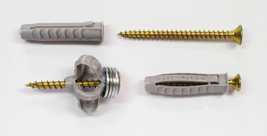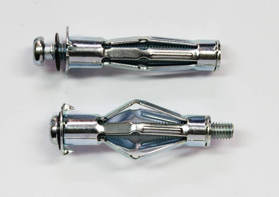 - Под дюбель — зонт или бабочку предварительно сверлятся отверстия, в которые вставляются метизы. При завинчивании шурупа под тыльной стороной ГКЛ раскроются упоры, зафиксировав крепёж. Подобной методикой можно навешивать предметы с нагрузкой до 10-15 кг на 1 точку.